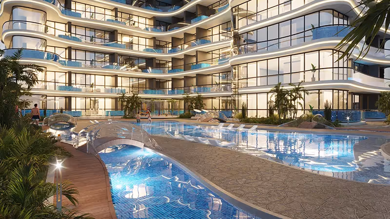 Experience a lifestyle enriched with exclusive services and amenities, including valet parking, concierge services, leisure pool deck, outdoor cinema, kids play area, outdoor and indoor gyms, barbeque area, and steam and sauna facilities. The façade sets a new standard for luxury living in Dubai, where every detail is crafted to perfection.